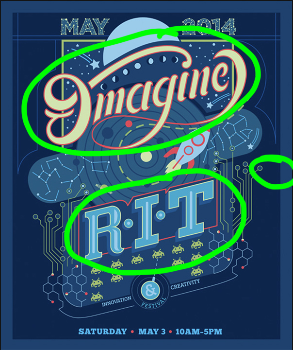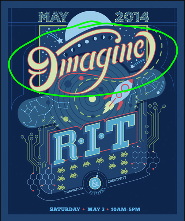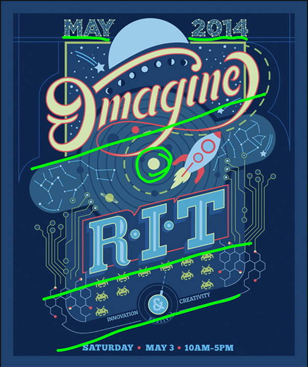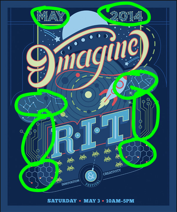 This poster also contains a lot of repetition. There are repeated elements throughout. This also falls under alignment because this poster is very balanced. A lot of the elements like the constellations and the video game type patterns are repeated on both side of the poster. Even the little alien guys are repeated. The bright pinky red color is also used around the Imagine word and then again around the very different RIT font to create continuity between the two.